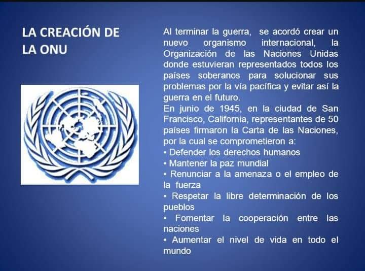 Las Naciones Unidas son una organización internacional fundada en 1945 tras la Segunda Guerra Mundial por 51 países que secomprometieron a mantener la paz y la seguridad internacionales, fomentar entre las naciones relaciones de amistad y promover el progreso social, la mejora del nivel de vida y los derechos humanos.